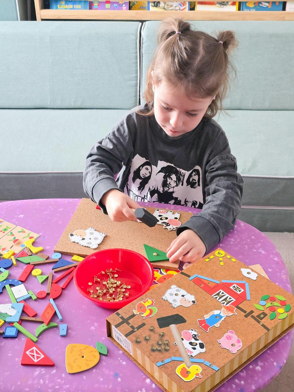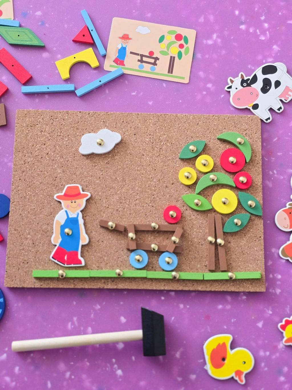 🏗️ Build Your Imagination: Embark on a farming adventure like no other! With this deluxe set, your child can create their very own farm-themed masterpiece.  Using the included nails and hammer, gently tap tap the pieces onto the corkboard to bring your vision to life. Once your picture is complete, simply remove the nails, and wooden tile pieces to start anew. Each wooden tile features a convenient small hole, ensuring effortless nail placement into the corkboard. Plus, we've included design cards to ignite your child's artistic flair.
