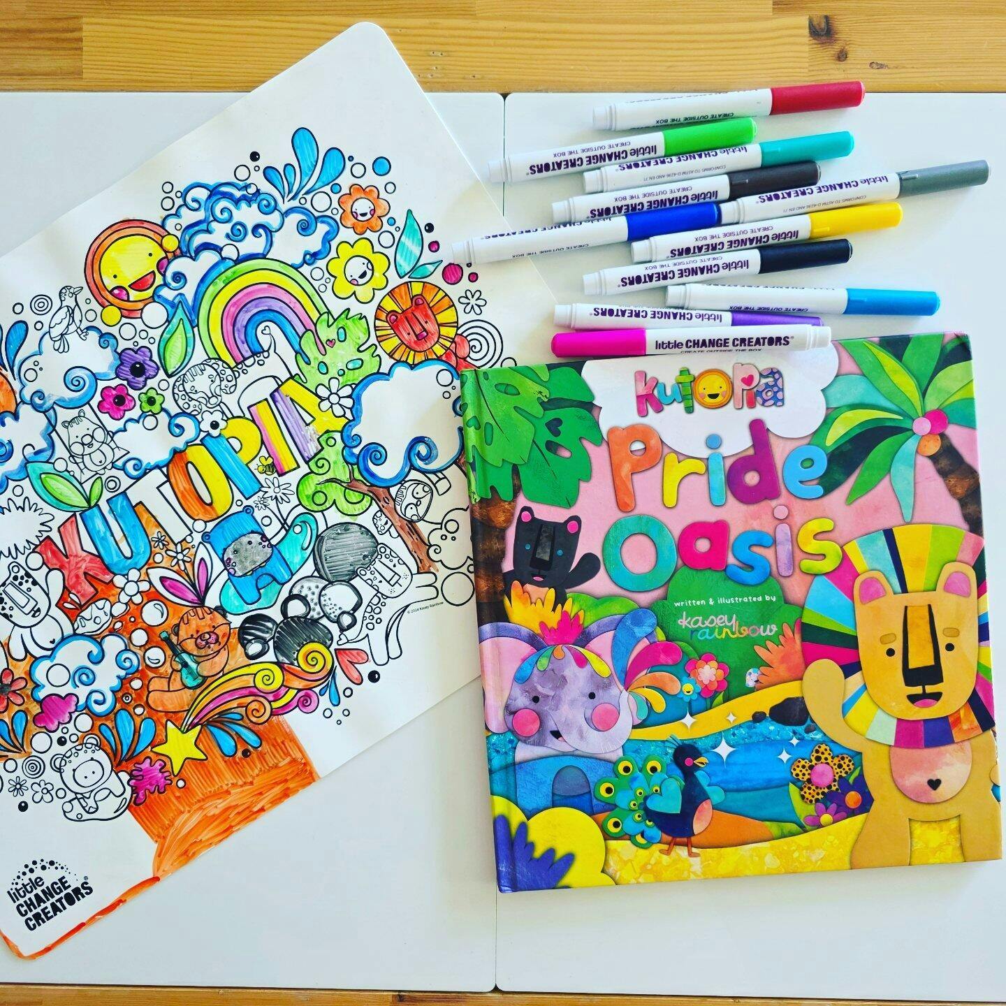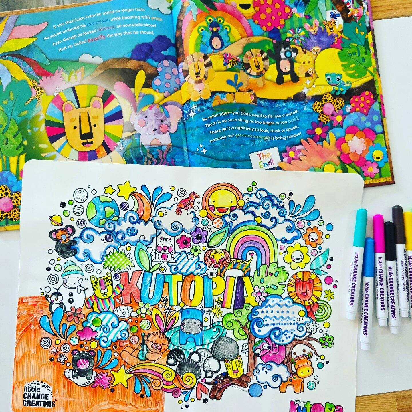Step into the world of KUTOPIA, where art and imagination collide in this vibrant, eco-friendly colouring set designed by renowned Australian artist Kasey Rainbow. This playful and inspiring set features Kasey’s signature colourful characters, making it a perfect canvas for young artists to explore their creativity!