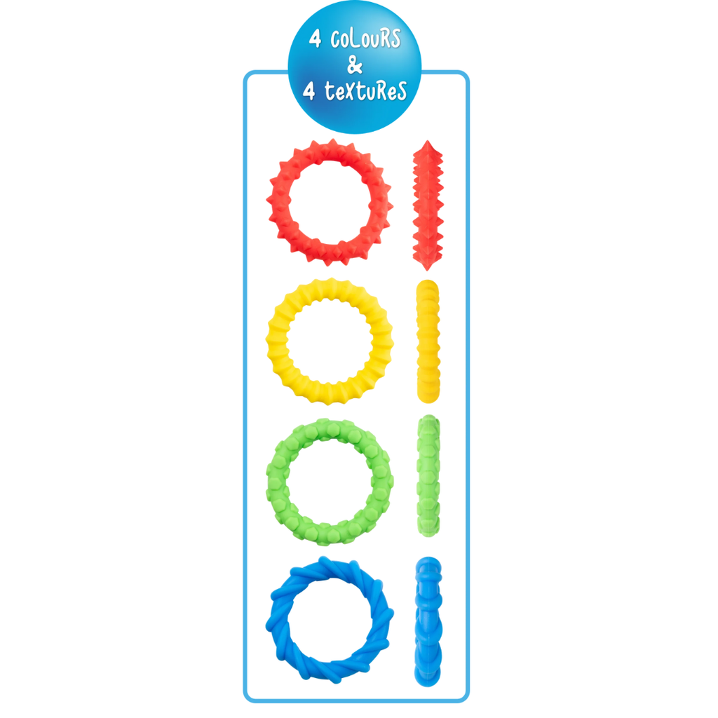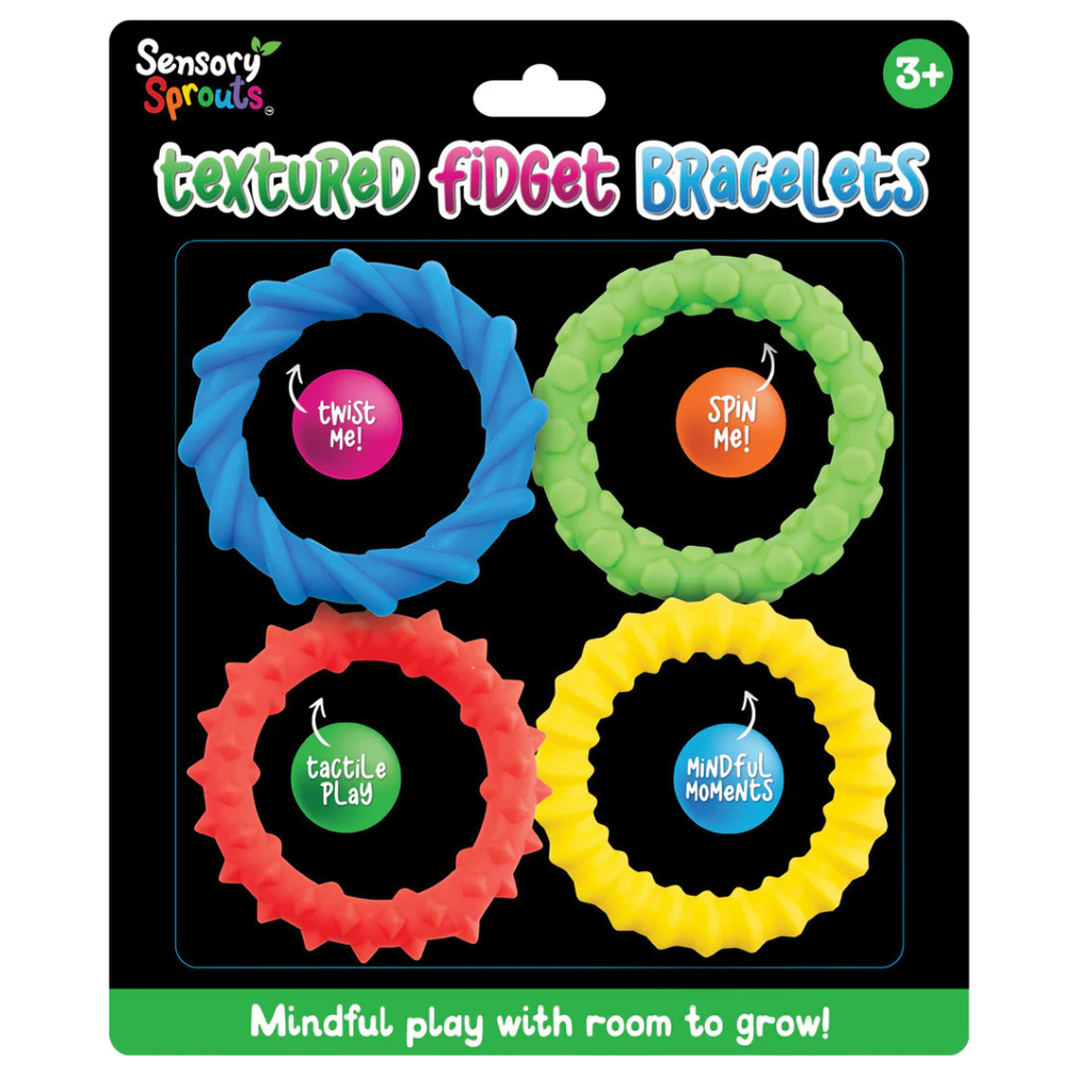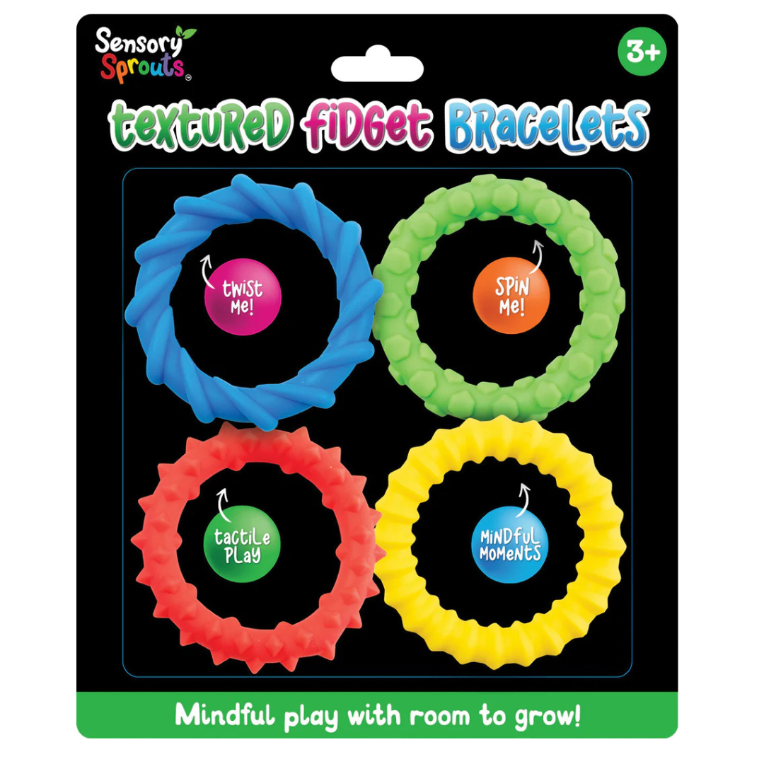 Each soft, flexible bracelet features a variety of raised textures to touch, squeeze, or rub, providing soothing sensory feedback that helps manage restlessness, anxiety, and sensory-seeking behaviours. Comfortable to wear and quiet in use, they’re ideal for group time, transitions, or independent learning without disrupting others.
