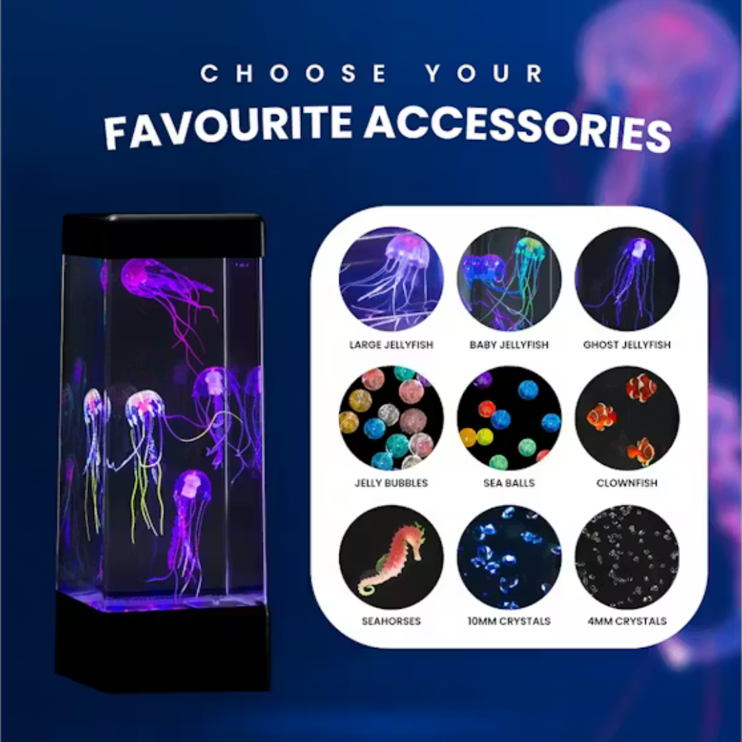 All accessories are designed to move gently within the water and interact with the lamp’s LED lighting to create slow, soothing motion and soft colour effects.