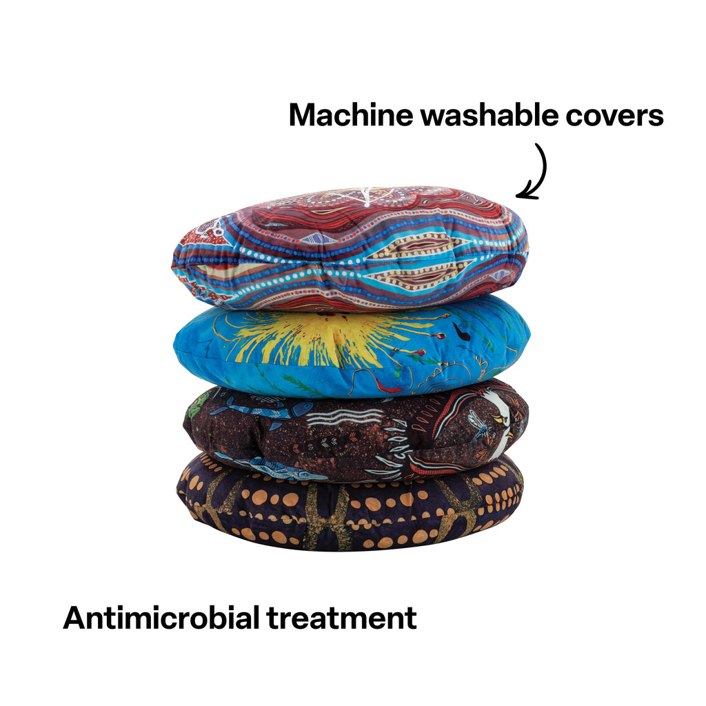 Create a warm, welcoming, and culturally rich learning environment with our Aboriginal Art Round Cushions. This set of four vibrant cushions showcases authentic Indigenous artworks by respected artists Billyara and Charlie Wicking, bringing story, symbolism, and connection into your classroom spaces.
