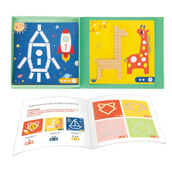 Using magnetic wooden sticks in a range of lengths, children recreate pictures and designs by placing the sticks onto illustrated activity cards. Designs include engaging images such as a lion with a fiery mane, a ladybug with spots, a rocket, a tall giraffe, and a majestic castle. Children can follow the cards closely, fill in images with sticks, or mix and match pieces to create their own patterns and designs.