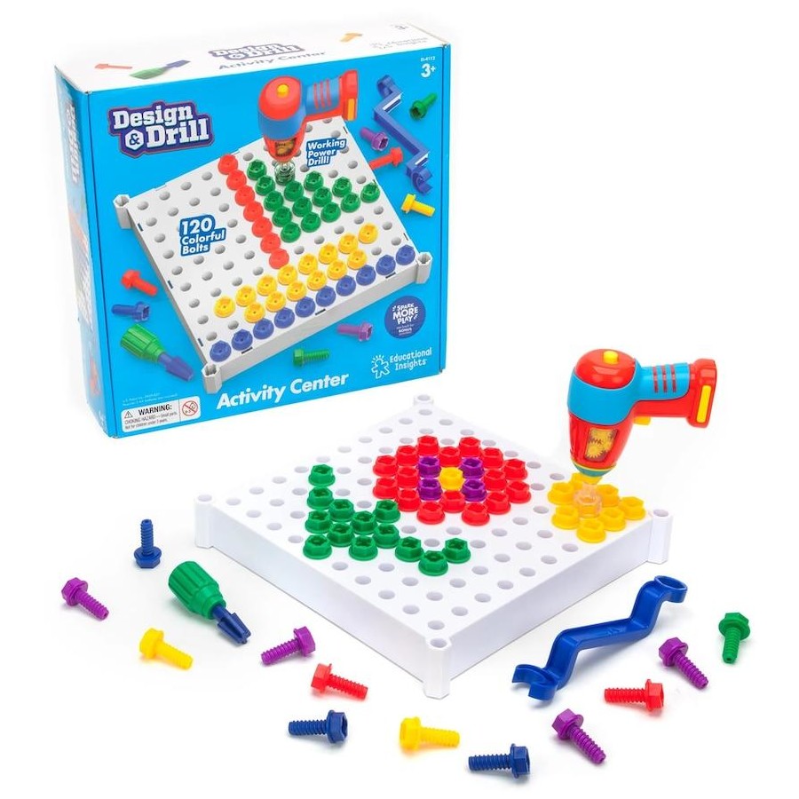 Power up playtime with hands-on building fun that supports creativity, coordination, and early STEM skills. The Design & Drill Activity Center invites children to use chunky, child-sized tools and bolts to bring colourful pictures, patterns, and their own ideas to life on a sturdy activity board.